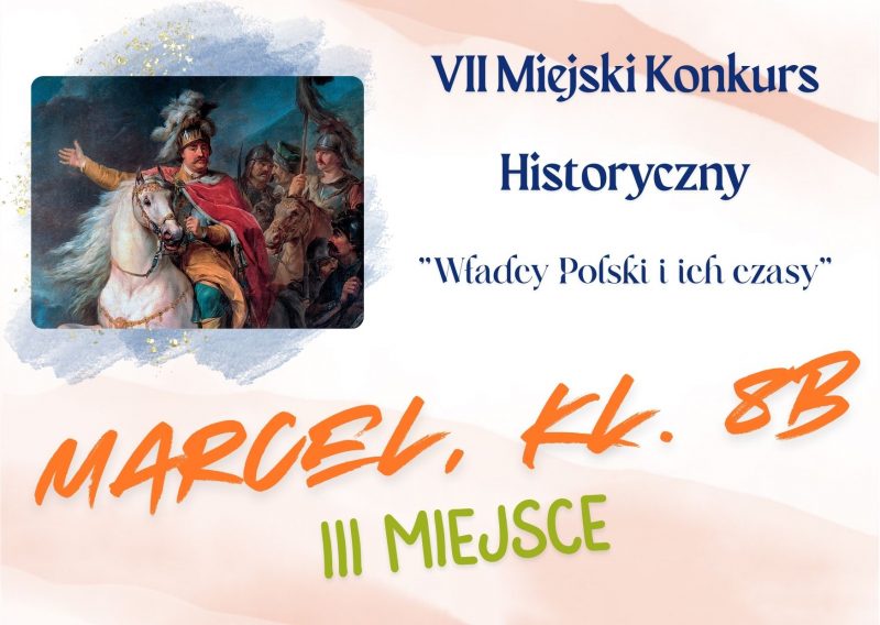 Dzisiaj, w Centrum Edukacji w Zabrzu odbył się VII Miejski Konkurs Historyczny „Władcy Polski i ich czasy. W tym roku tematem konkursu był „Jan III Sobieski – postać ciekawa i ważna w historii naszego kraju”. Do konkursu przystąpili uczniowie klas VII i VIII z zabrzańskich szkół podstawowych. Miło nam poinformować, iż Marcel Sichma uczeń klasy 8b naszej szkoły zajął III miejsce. Jesteśmy dumni z sukcesu naszego ucznia. Serdecznie gratulujemy! ????????????