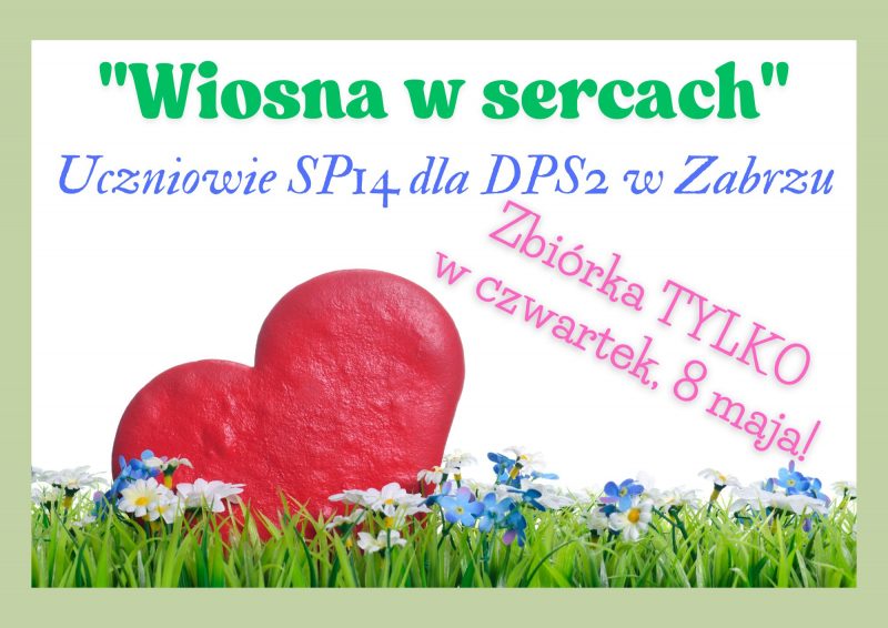Uczniowie klasy 8c zapraszają do udziału w akcji „Wiosna w sercach„, której celem jest pomoc w ukwieceniu tarasu oraz ogródka Domu Pomocy Społecznej Nr 2 w Zabrzu. Chcemy, by podopieczni DPS Nr 2 mogli wypoczywać w pięknych okolicznościach przyrody.