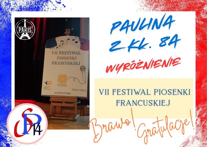 W konkursie wystartowała nasza Paulina Karnas, uczennica klasy 8a. Wykonując utwór Mireille Mathieu „Pardonne-moi ce caprice d’enfant” wyśpiewała sobie i naszej szkole wyróżnienie w kategorii klas starszych szkół podstawowych.
