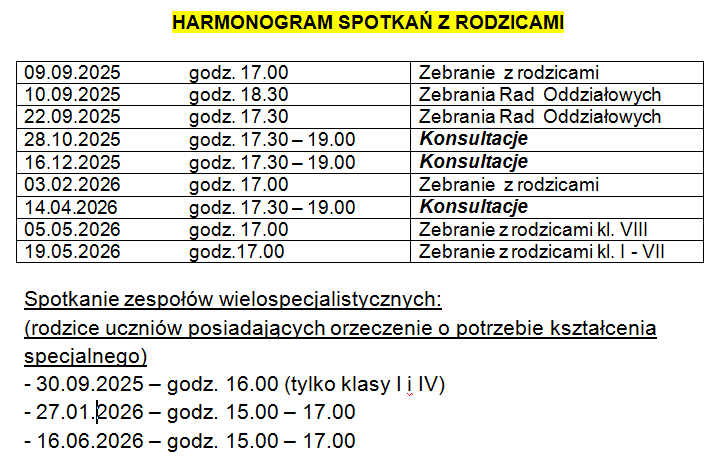 HARMONOGRAM SPOTKAŃ Z RODZICAMI – ROK SZKOLNY 2025/2026